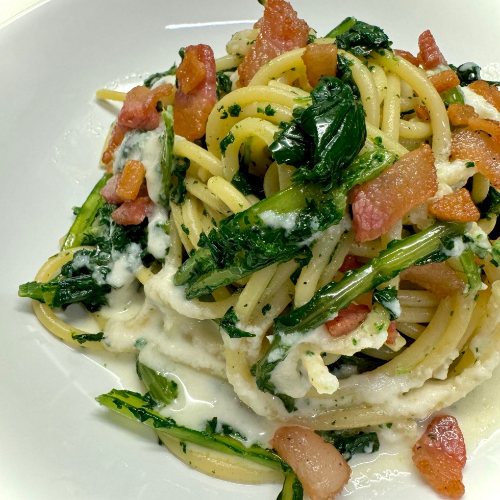 Pasta con Cicoria, Guanciale e crema di Pecorino