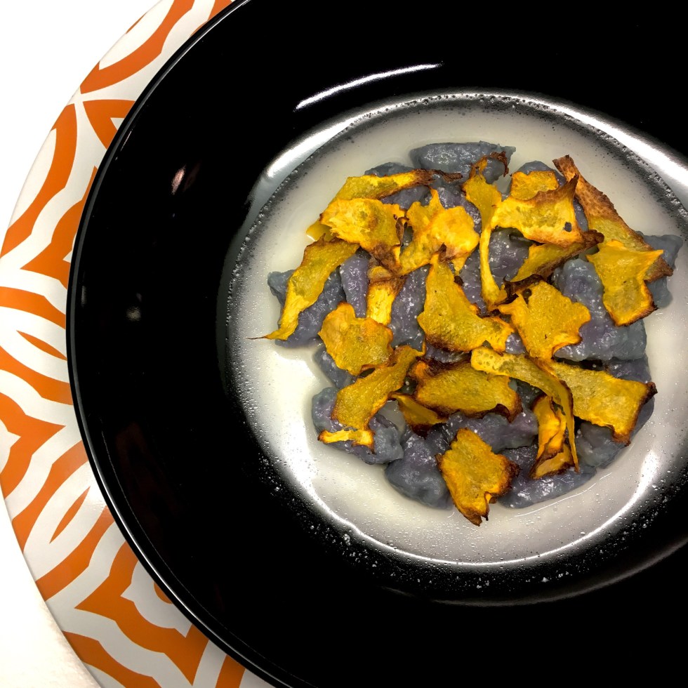 Gnocchi di patate Viola con colatura di Provola e petali di Zucca