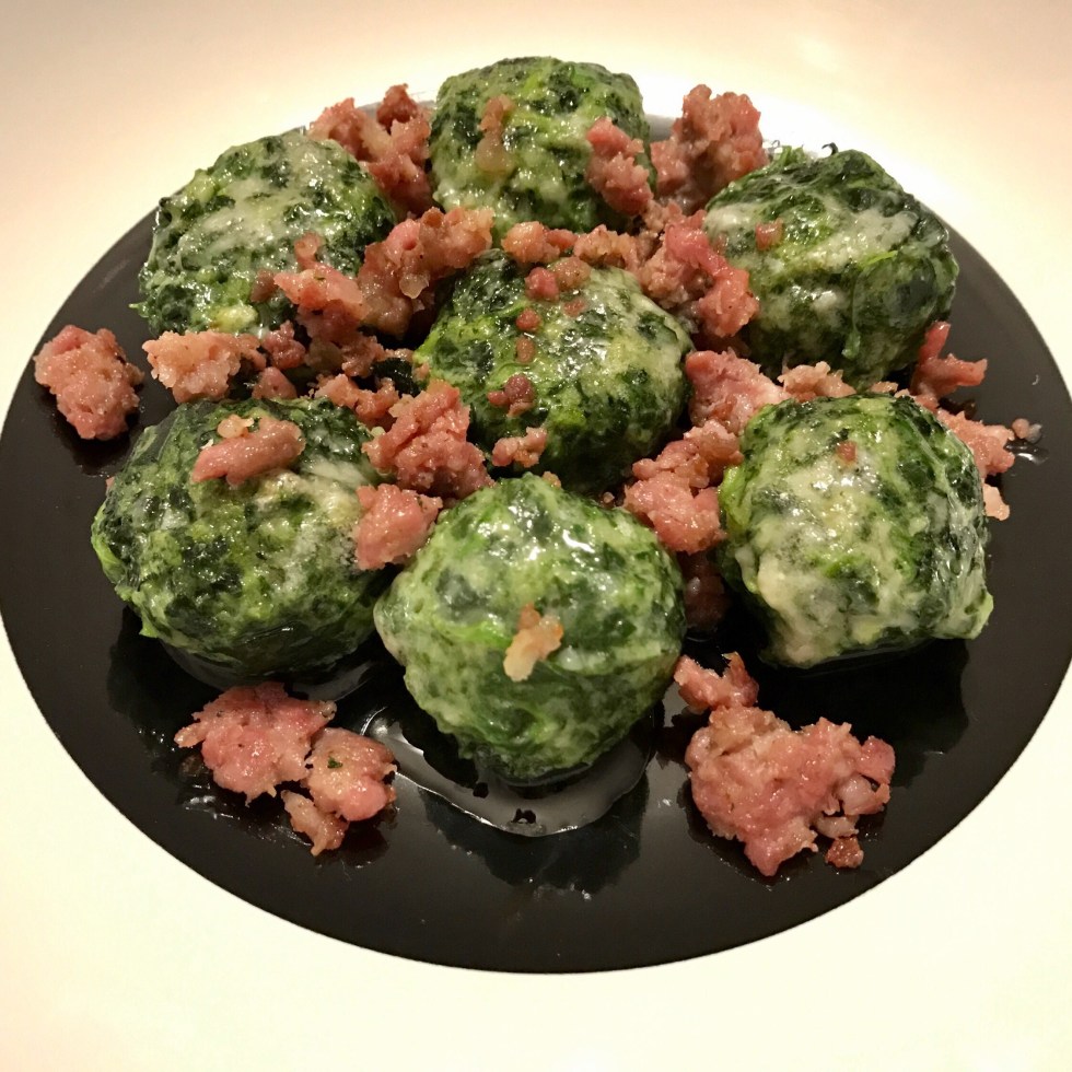 Malfatti Ricotta e Spinaci al burro versato con Salamella sbriciolata