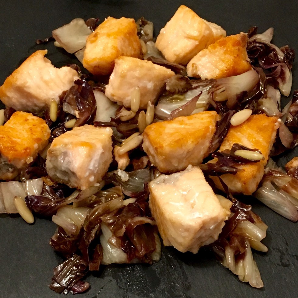 Dadolata di Salmone alla Soia con Radicchio & Pinoli