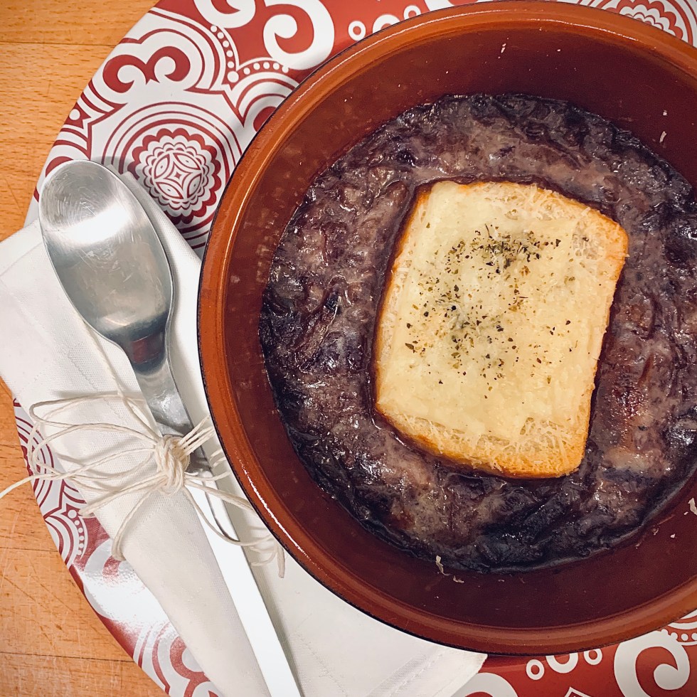 Zuppa di Cipolle Rosse gratinata, con Pane e Fontina