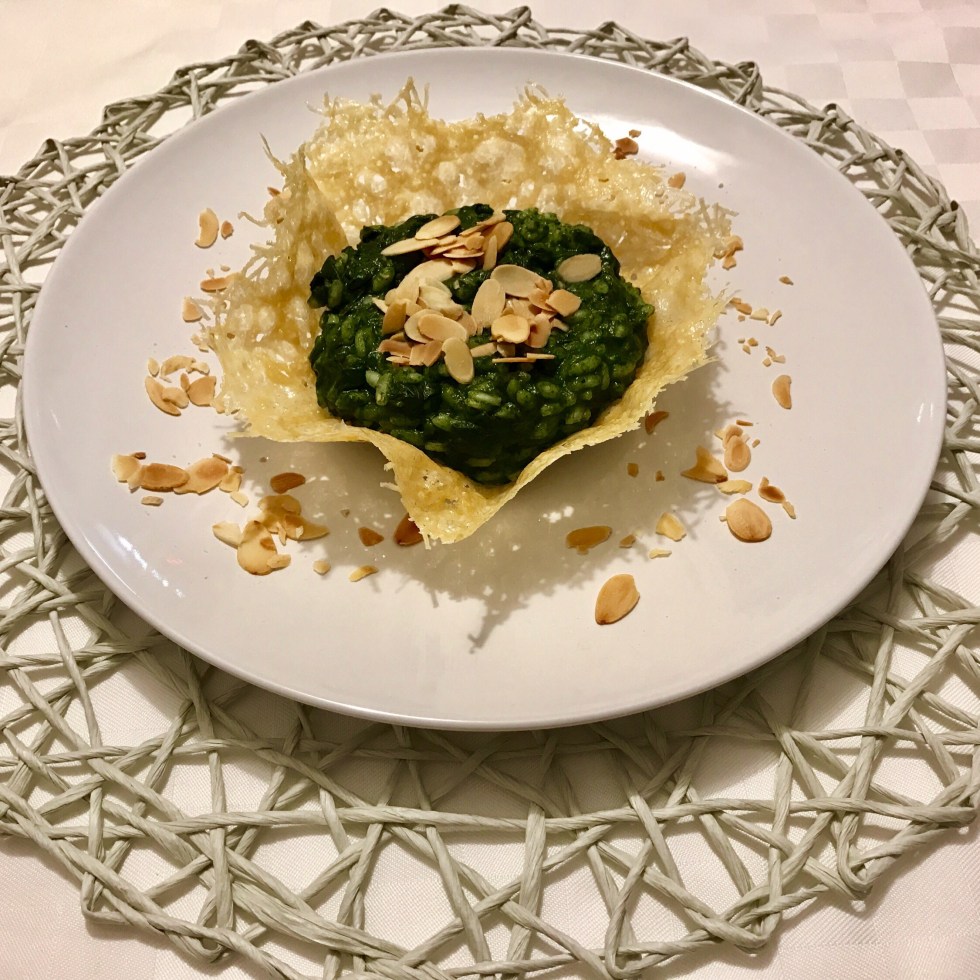 Risotto alla Crema di Spinaci e Mandorle tostate, in cesto di Parmigiano
